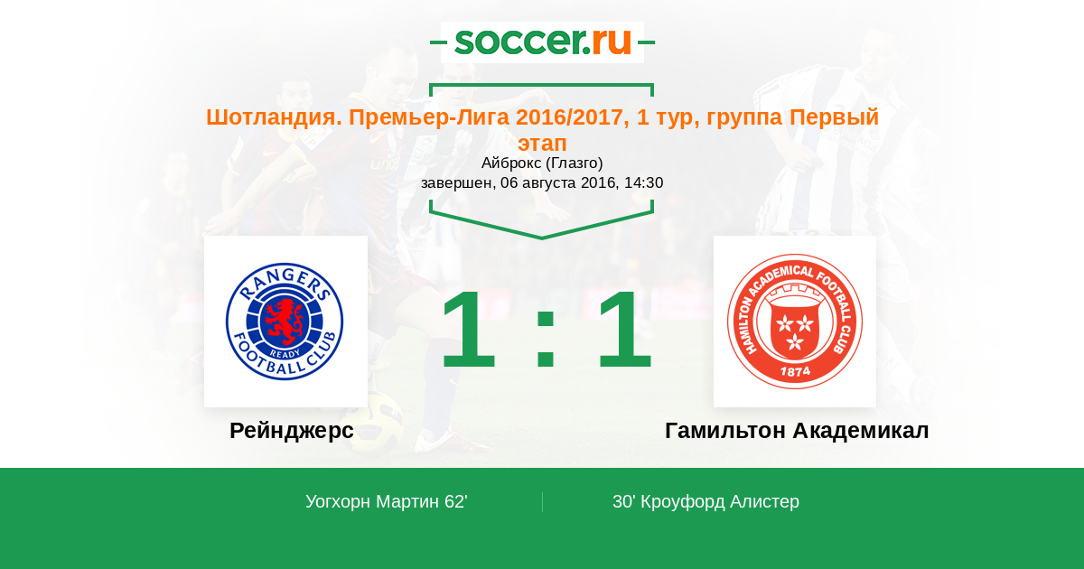 Рейнджерс - Гамильтон Академикал: обзор матча 6 августа 2016
