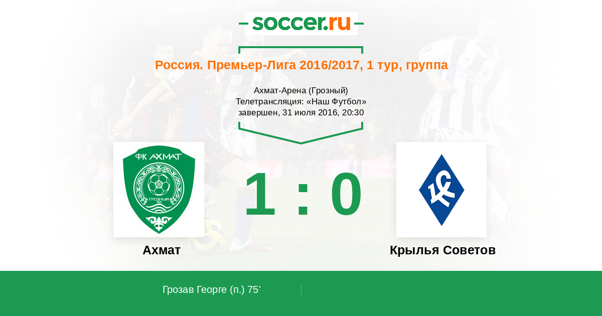 Здравствуйте, уважаемые любители отечественного футбола! Субботняя программа 1-го тура Чемпионата России по футболу 2016/2017 заканчивается матче в Грозном, где местный "Терек" окажет прием самарскому клубу "Крылья Советов". Нет сомнений, что для обеих команд важно успешно стартовать в турнире, поэтому сегодня мы увидим бескомпромиссную борьбу за результат на футбольном поле. Игра начнется в 20.30 по московскому времени, текстовую трансляцию для вас буду вести я, Роман Земко. Следите за основными событиями матча на soccer.ru!