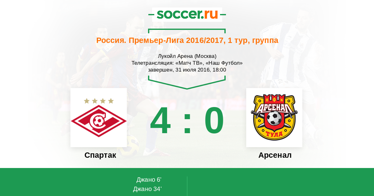 Яркую победу одерживает "Спартак" в 1-ом туре РФПЛ над тульским "Арсеналом". Индивидуальное мастерство Джано положило начало разгрому "пушкарей", а далее удобный счет позволил "красно-белым" играть в свой излюбленный футбол, а футболисты гостевой команды просто стали. Пожелаем удачи "Спартаку" в ответной игре в квалификации Лиги Европы с кипрским "АЕКом". Вы можете определить лучших игроков этого матча: http://www.soccer.ru/matches/ratings/1013584.shtml. Текстовую онлайн-трансляцию для вас вел Роман Земко, до новых встреч на soccer.ru!