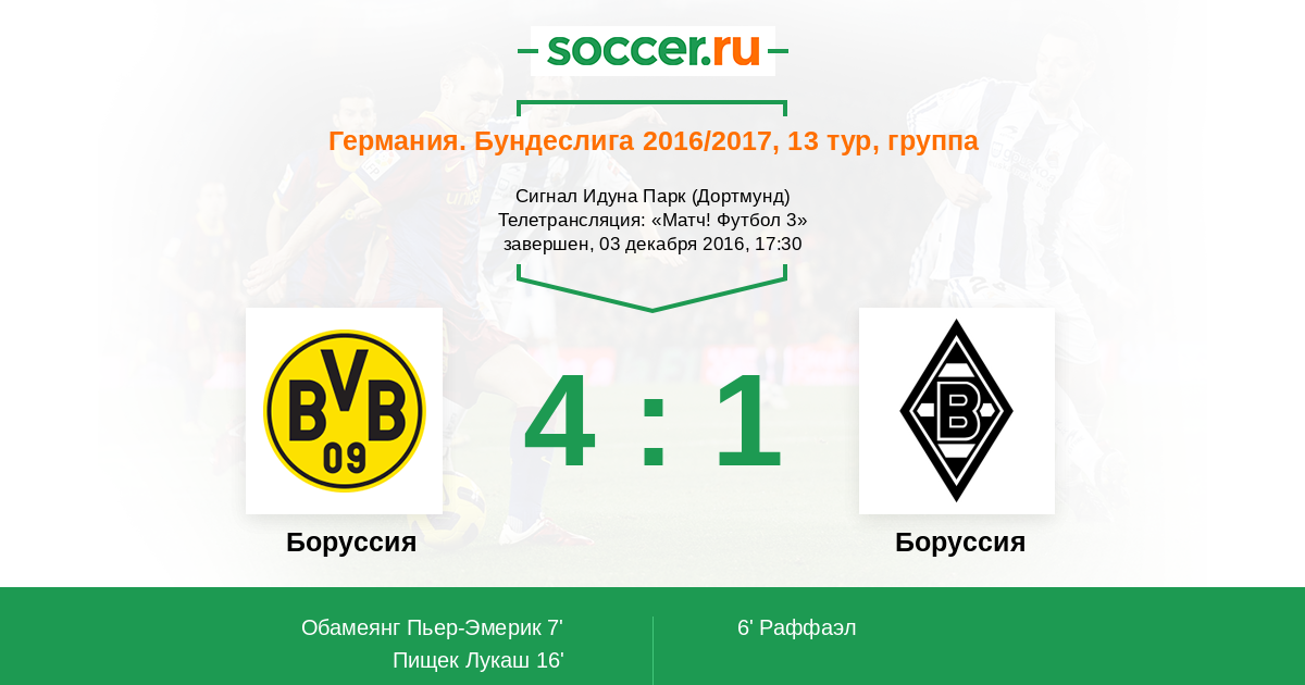 На сегодняшний день та "Боруссия", что из Дортмунда просто на голову сильнее той, что из Менхенгладбаха! Подопечные Томаса Тухеля вчистую переиграли "жеребцов", во втором тайме лишь подтвердив свое превосходство. Ассистентский хет-трик оформил Марко Ройс, четвертый матч подряд забивает в Бундеслиге Обамеянг, прекрасно отыграл Дембеле, который постоянно напрягал левый фланг обороны соперника, а в защите был неподражаем Марк Бартра. "Гладбах" не может выиграть 8 встреч подряд в национальном чемпионате, и над головой Шуберта продолжают виснуть тучи. "Соккер.ру" предлагает Вам выбрать лучших игроков матча. Текстовую онлайн-трансляцию вел Роман Земко. Всего доброго, до новых встреч!