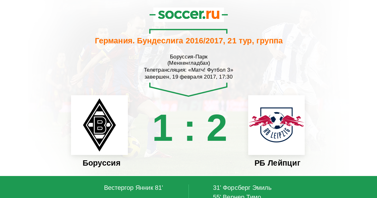Прозвучал финальный свисток Феликса Цвайера, который зафиксировал непростую выездную победу "РБ Лейпцига" над "Боруссией" из Мёнхенгладбаха - 1:2! Уже после окончания игры у ворот Гулачи случилась небольшая заварушка с участием Забитцера, Вернера и Янчке, но раздавать карточки налево и направо главный арбитр не стал. На точные удары Эмиля Форсберга и Тимо Вернера гладбахцы ответили голом защитника Янника Вестергора, но на большее "жеребцам" не хватило ни сил, ни времени. Таким образом, "быки" закрепили за собой вторую строчку в таблице - теперь их отставание от "Баварии" равняется 5 очкам, а отрыв от "Боруссии" из Дортмунда и "Хоффенхайма" - 8 баллам. "Гладбах", в свою очередь, прервал свою 3-матчевую победную серию в Бундеслиге. Рискует "Боруссия" уступить 10-е место "Шальке". На этом всё. Вы можете выбрать лучших игроков поединка. С вами был Олег Олезов. Любите футбол и оставайтесь с нами на http://www.soccer.ru