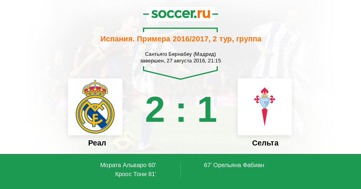 Все! Матч завершен! Мадридский "Реал" в непростом поединке дожимает "Сельту" со счетом 2:1 и набирает очередные три очка. Голы в матче забивали Альваро Мората и Тони Кроос у "Реала" и Фабиан Орельяна у "Сельты". Предлагаем Вам выбрать лучших игроков матча в составах обеих команд: http://www.soccer0001.com/matches/ratings/1016768.shtml. Для Вас эту трансляцию провел Андрей Бабенчук. Оставайтесь на http://www.soccer.ru/ !