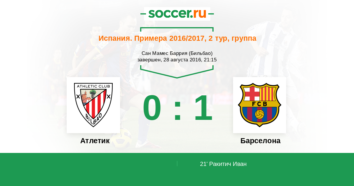 Добрый вечер всем любителям испанского футбола! Рады приветствовать Вас на матче второго тура Примеры, в котором на стадионе "Сан Мамес Баррия" встретятся местный "Атлетик" и каталонская "Барселона". Для Вас онлайн-трансляцию этой встречи проведет Андрей Бабенчук.
