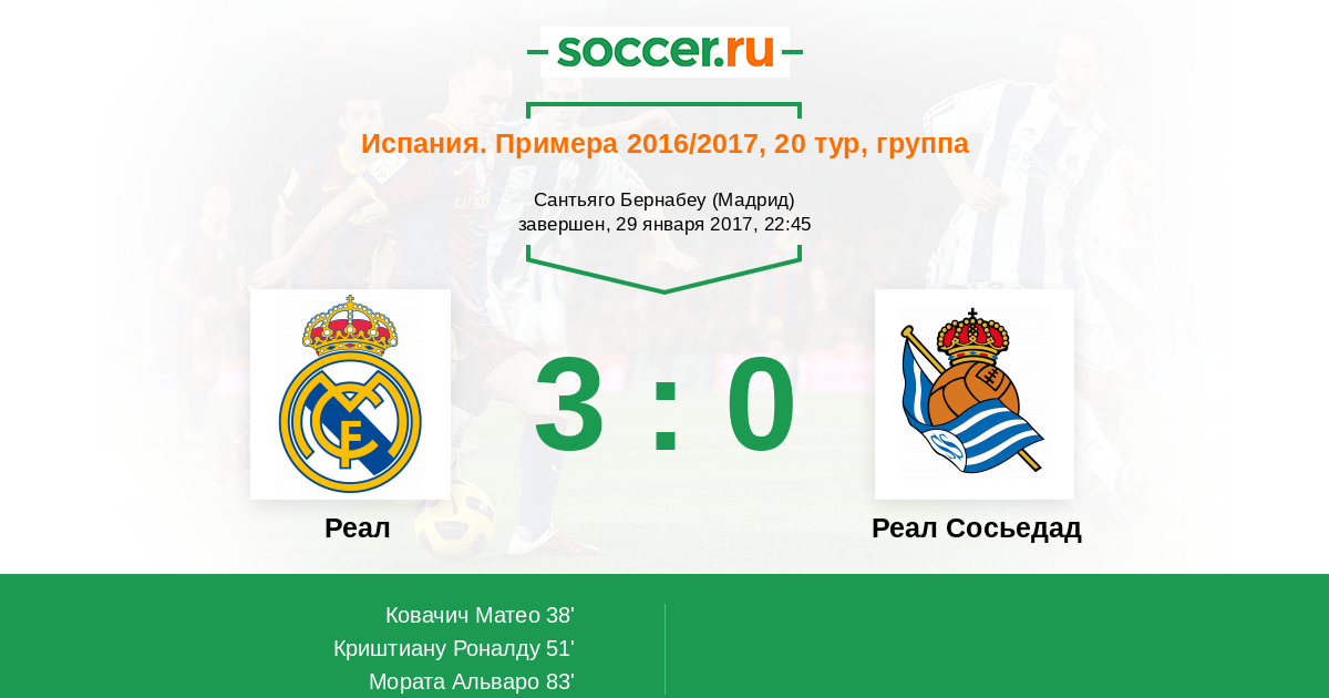 Подопечные Зинедина Зидана пользуются осечками "Севильи" и "Барселоны", обыгрывают "Реал" из Сан-Себастьяна и еще больше увеличивают отрыв от ближайших преследователей. У "сливочных" имеется игра в запасе, а потому потенциальный отрыв от каталонцев и нервионцев, в случае победы, будет равен 7-и очкам. "Сосьедад" сохраняет за собой 5-ое место, подпуская к себе на близкое расстояние "Вильярреал" и "Атлетик", синхронно одержавшие виктории в этом туре. Вы можете определить лучших игроков встречи на Ваш взгляд. Текстовую онлайн-трансляцию вел Роман Земко. До новых встреч на "Соккер.ру", всего доброго!