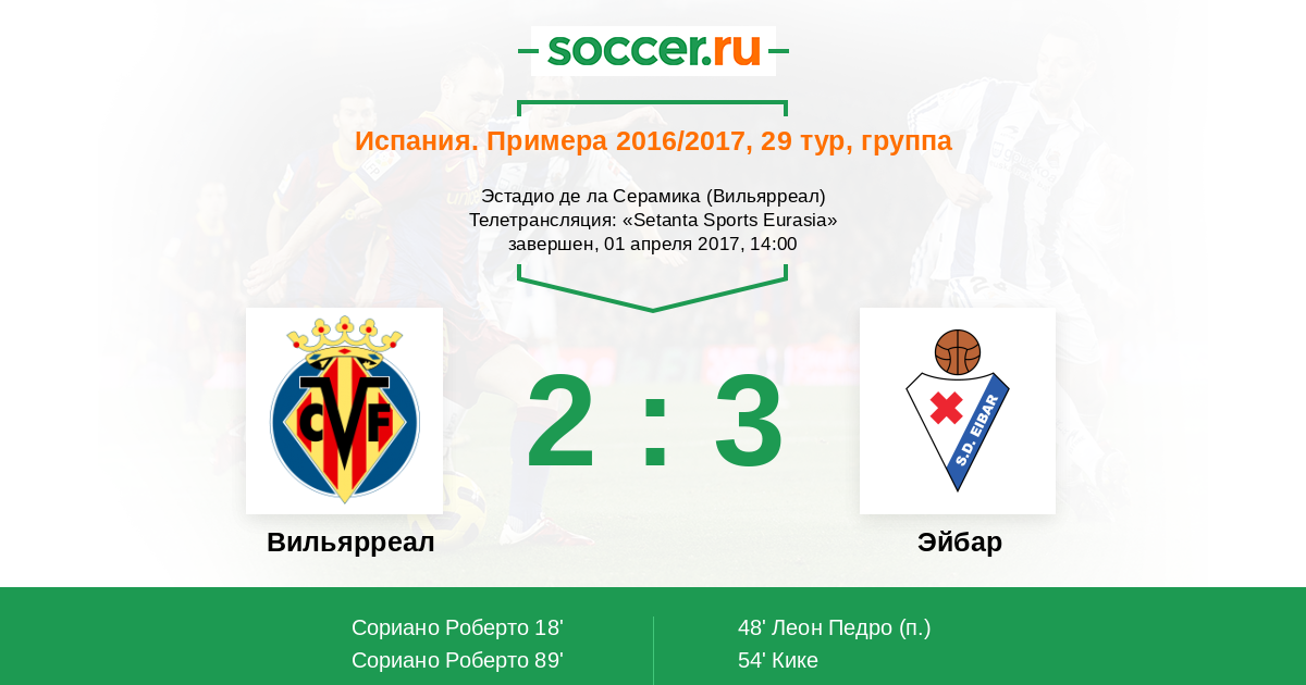 Все! Матч завершен! "Эйбар" добывает волевую выездную викторию над "Вильярреалом" со счетом 3:2. Голами в составе "оружейником" отметились Педро Леон, Кике и Такаси Инуи, в составе "Вильярреала" дубль в активе Роберто Сориано. Предлагаем Вам выбрать лучших игроков этого матча в составах обеих команд. Для Вас прямую онлайн-трансляцию этого поединка провел Андрей Бабенчук. Оставайтесь на http://www.soccer.ru/