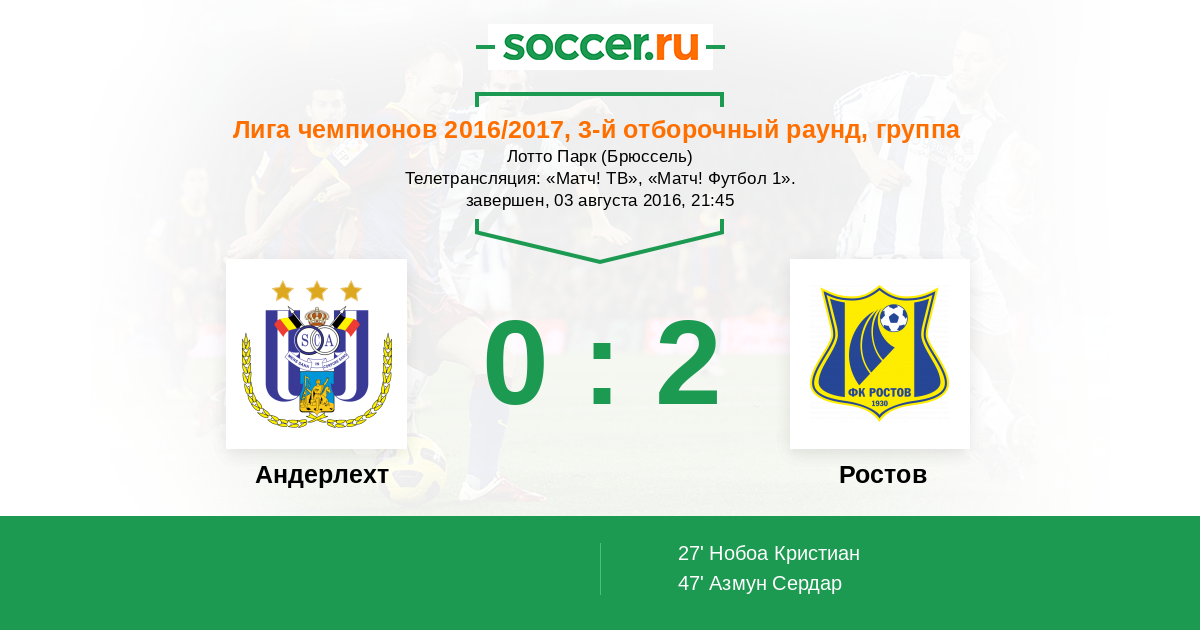 Приветствуем всех поклонников футбола! Сегодня в Бельгии состоится ответный матч квалификационного раунда Лиги Чемпионов, в котором "Андерлехт" будет принимать "Ростов". В первом поединке победитель выявлен не был, однако забитые мячи на выезде увеличивают шансы на общий успех хозяев предстоящей встречи. Счет первого матча не устраивает российский клуб и Курбану Бердыеву вместе с "Ростовом" предстоит теперь решать задачу с выходом в финал квалификации на выезде. Получится ли у ростовчан тактически переиграть более опытного оппонента? Сайт http://www.soccer.ru проведёт прямую текстовую онлайн трансляцию матча, следить за событиями на поле и комментировать игру для вас будет Старчеус Сергей.
