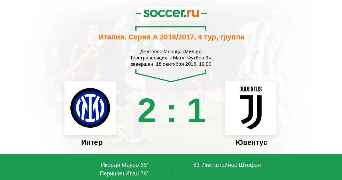 Добрый вечер уважаемые любители футбола! Приглашаем вас на центральный матч 4-го тура итальянской Серии А, миланский "Интер" будет принимать действующего чемпиона Италии, туринский "Ювентус". Туринцы, несмотря на выездной статус, фавориты встречи. В нынешнем чемпионате они не потеряли еще ни одного очка и рассчитывают продолжить победное шествие в Милане. Станет ли "Интер" очередной жертвой "старой синьоры"? Сайт http://www.soccer.ru проведёт прямую текстовую онлайн трансляцию матча, следить за событиями на поле и комментировать игру для вас будет Старчеус Сергей.