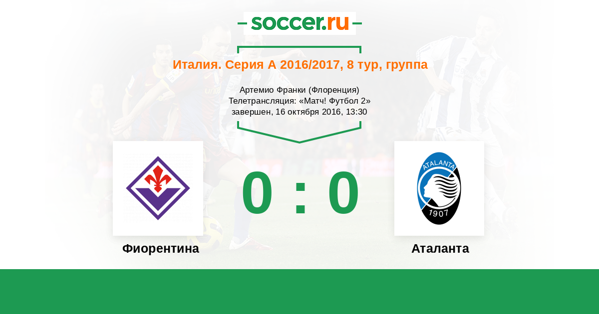 Добрый день всем любителям футбола! Рады приветствовать Вас на матче 8-го тура итальянской Серии А, в котором во Флоренции на стадионе "Артемио Франки" сойдутся местная "Фиорентина" и "Аталанта". Команды не совсем удачно начали новый сезон, но если для "Аталанты" находится во второй половине таблице - привычное дело, то место "фиалок" потенциально значительно выше, нежели 14-ое место. Нужно делать что-то Паулу Соузе, чтобы вывести команду из кризиса, ведь "короли провинциалов" находятся выше "Фиорентины" в турнирной таблице Серии А. Для Вас прямую онлайн-трансляцию этой встречи проведет Андрей Бабенчук.