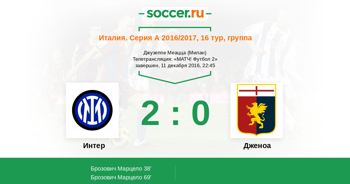 Подопечные Ивана Юрича провели неплохой матч, но забить "грифонам" так и не удалось! Забей в первом тайме "Дженоа", неизвестно как бы сложилась игра! Дубль Марсело Брозовича приносит важную победу "нерадзурри", благодаря которой "Интер" поднимается на восьмую строчку в турнирной таблице! Предлагаем выбрать лучших игроков в составах команд, комментировал для вас Дмитрий Отмахов. До новых встреч на soccer.ru.