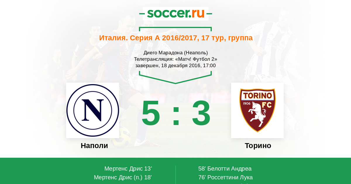 Доброго времени суток, уважаемые любители футбола! Сегодня в 17 - м туре Серии А один из главных преследователей "Ювентуса" последних лет "Наполи" примет "Торино". Неаполитанцы и туринцы по праву считаются одними из самых "играющих" команд в Италии. Больше чем "Наполи" и "Торино" в этом сезоне забили только "Ювентуc" и "Рома". По предматчевым раскладам на поле "Сан-Паоло" этим вечером может случиться перестрелка с большим количеством забитых мячей. Несмотря на последние результаты команд, данная игра из разряда "на три исхода". В прошлом сезоне "партенопейцы" дважды были сильнее "быков". Будет ли всё так однозначно на этот раз? Узнаем совсем скоро из текстовой трансляции на http://www.soccer.ru, которую для вас проведёт Олег Олезов.