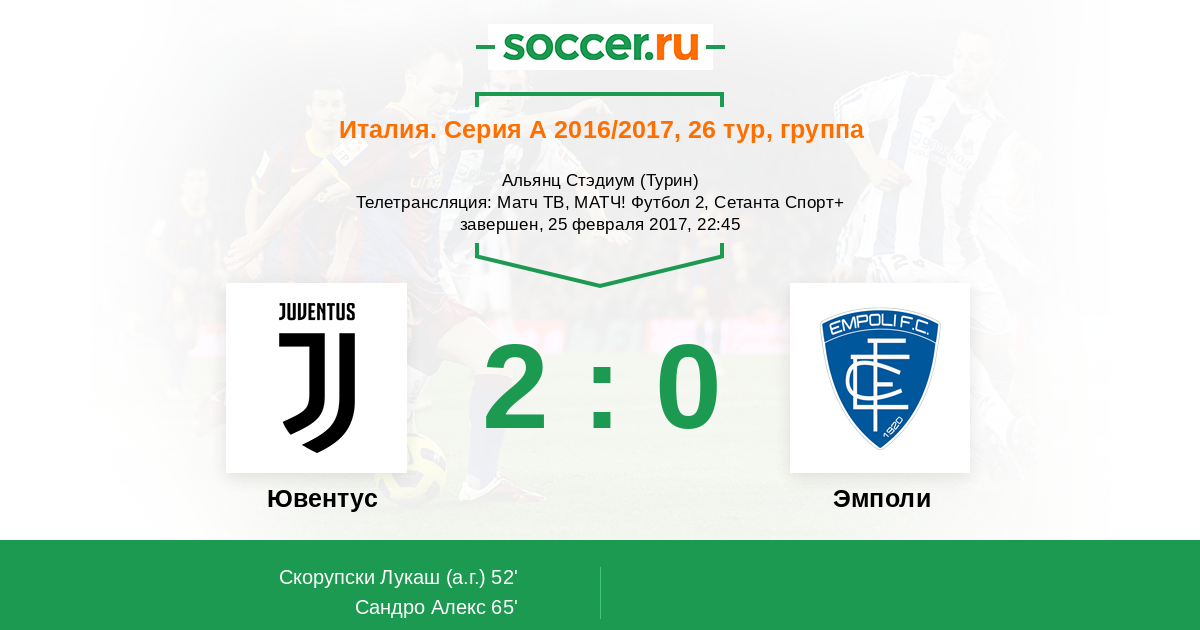 "Ювентус" деклассировал "синих" во втором тайме и заработал дежурные три очка. Марио Манджукич на протяжении всего матча отлично действовал на втором этаже и всё-таки смог оформить взятие ворот соперника. Правда, чуть позже его гол переписали на автогол голкипера, как это часто бывает в Серии А. Далее зажигала уже южноамериканская тройка (Алвес-Куадрадо-Сандро), именно их удачные действия привели ко второму голу. В концовке "бьянконери" играли в своё удовольствие, создав пару действительно опасных моментов у ворот Скорупски. "Ювентус" обгоняет "Наполи" уже на 11 очков, а "Роме" завтра предстоит сложнейшая игра с "Интером". "Эмполи" же остаётся на своём 17 месте и в следующем туре встретится с "Дженоа", Текстовую онлайн-трансляцию провёл Глеб Васильев. До новых встреч!