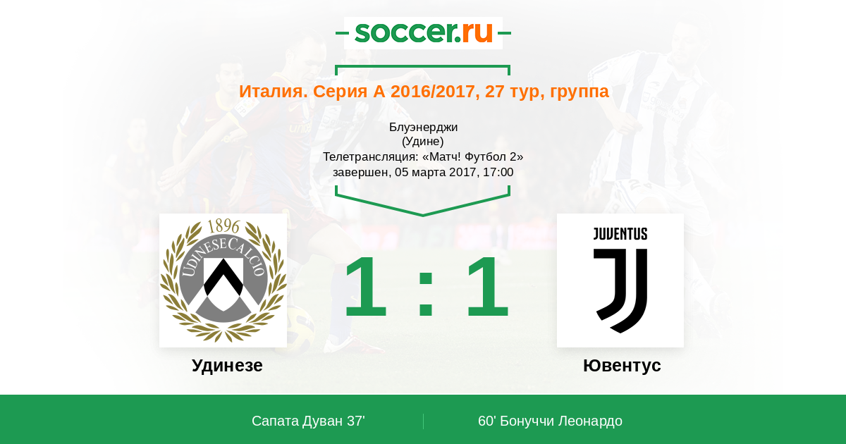 Всё! Впервые в сезоне сыграл вничью туринский "Ювентус" - 1:1. Гол Леонардо Бонуччи на исходе часа игры позволил команде Аллегри избежать поражения в Удине. Вообще, невзрачный матч провели представители "старой синьоры", поэтому исход поединка закономерен. Таким образом, отрыв "Юве" от конкурентов вырос всего лишь на одно очко. "Удинезе" по-прежнему на 14-й строчке в Табели о рангах. На этом всё. С вами был Олег Олезов. Вы можете выбрать лучших игроков матча. Спасибо за внимание и до новых встреч на http://www.soccer.ru