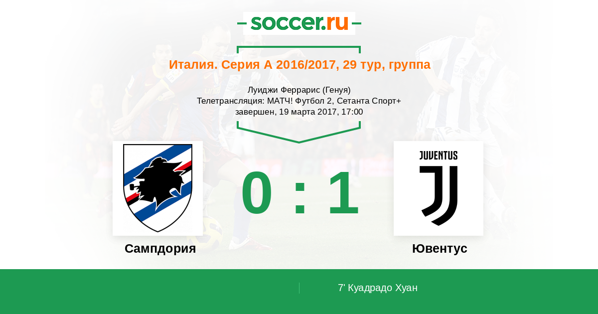 Добрый день, уважаемые пользователи «Соккер.Ру»! Сегодня мы отправляемся в Геную, где в 17:00 начнётся футбольный поединок между местной «Сампдорией» и лидером чемпионата Италии «Ювентусом». «Блучеркьяти» демонстрируют отличную игру и не собираются просто так отдавать очки команде Массимилиано Аллегри. Но все мы знаем, как «бьянконери» умеют разбираться с соперниками ниже классом, а потому просто подождём начала этой увлекательной встречи. Текстовую онлайн-трансляцию проведёт Глеб Васильев. Не пропустите!