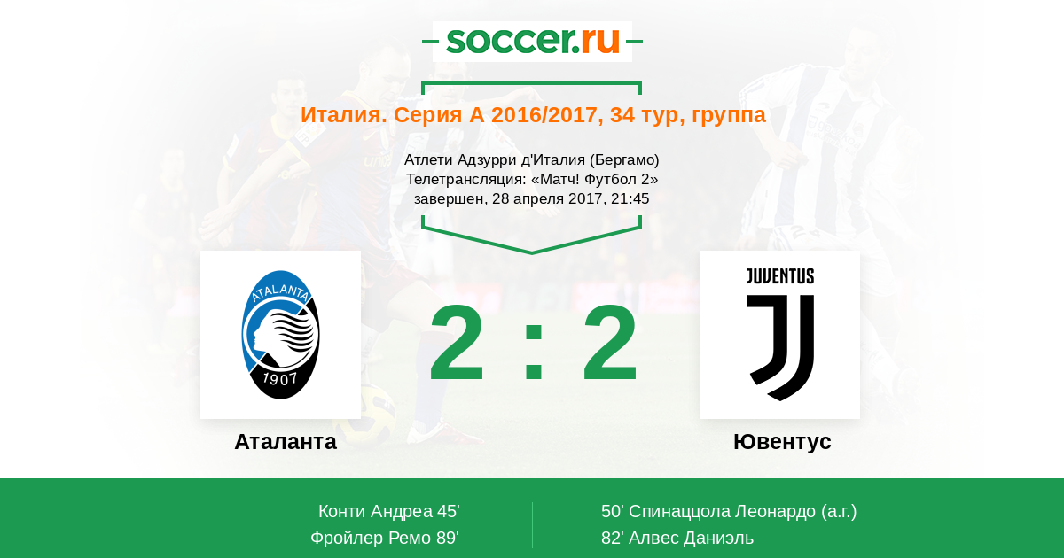 Во втором тайме "Ювентус" заметно прибавил в скорости, за счет чего "бьянконери" периодически переигрывали оборону "Аталанты", да вот только переиграть Беришу в многочисленных эпизодах не удалось. В совокупности моментов, конечно, подопечные Аллегри, пожалуй, заслужили победу, однако глупейшая ошибка Лихтштайнера и Пьянича в конце матча не позволила "зебрам" увезти три очка с "Атлети Адзурри". Бергамасков можно похвалить за проявленный характер - отчасти и из-за него хозяева поля смогли сравнять цифры на табло за минуту до конца основного времени. Вы можете определить лучших игроков на Ваш взгляд. Текстовую онлайн-трансляцию вел Роман Земко. До новых встреч на "Соккер.ру"!