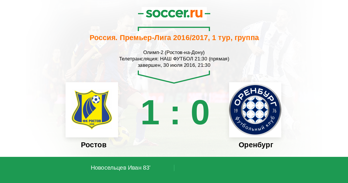 Здравствуйте, уважаемые любители футбола! Мы рады представить текстовый онлайн матча 1-го тура РФПЛ между "Ростовом" и "Оренбургом". В сегодняшнем поединке встречаются серебряный призер минувшего розыгрыша Премьер-Лиги, а также команда, сумевшая подняться в элиту из ФНЛ. "Оренбург", который до текущего лета носил название "Газовик", выиграл прошлый розыгрыш второго по силе российского дивизиона, набрав 86 очков и опередив на 4 балла "Арсенал" из Тулы. "Ростов" же отстал от победителя РФПЛ ЦСКА на 2 балла, но тем не менее все равно сумел впервые в своей истории получить путевку в Лигу чемпионов. Там ростовчане уже дебютировали на текущей неделе, сыграв дома вничью 2:2 с "Андерлехтом". В среду "Ростов" ждет ответная игра в Бельгии, и этот факт наверняка наложит отпечаток на действия команды Бердыева в сегодняшней встрече. Вполне возможно, что у новичка РФПЛ появится шанс приятно удивить своих болельщиков уже в первом туре. Как оно сложится на самом деле, узнаем скоро, начало матча "Ростов" - "Оренбург" сегодня, 30 июля, в 21-30 по московскому времени.