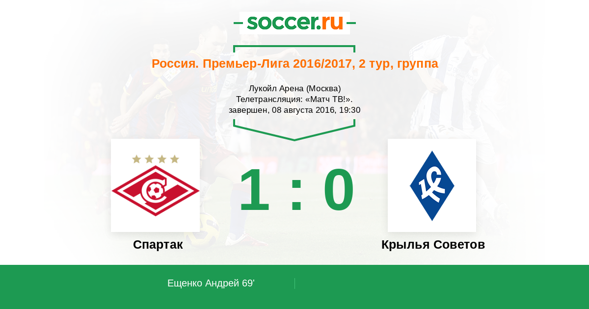 0' Добрый вечер уважаемые любители футбола! В матче 2-го тура РФПЛ, московский "Спартак" на своём поле будет принимать "Крылья Советов" из Самары. Не в лучшем психологическом состоянии выйдут на поле "Открытие Арены" нынешние оппоненты. В последних своих поединках они выступили неудачно, и в предстоящей встрече команды будут стремиться к реабилитации. Вылет "Спартака" в квалификации Лиги Европы от скромного кипрского "АЕК" повлек за собой тренерскую отставку Дмитрия Аленичева и его штаба. Как в такой ситуации пройдет матч против "Крыльев Советов"? Сайт http://www.soccer.ru проведёт прямую текстовую онлайн трансляцию матча, комментировать игру для вас будет Старчеус Сергей.