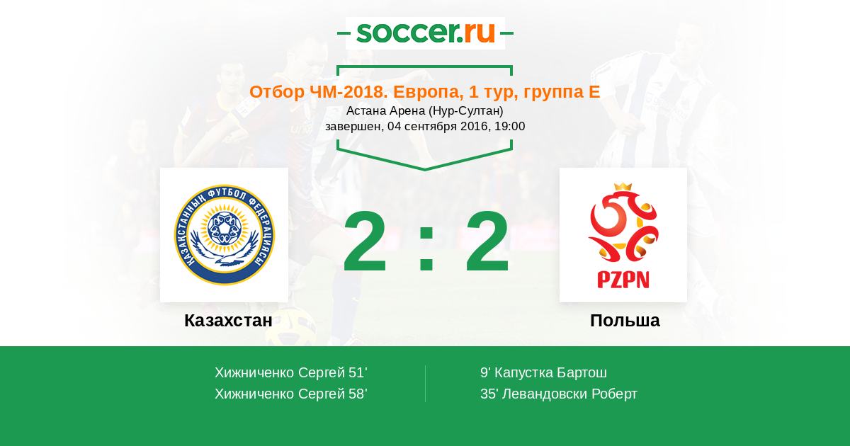 Всё! Первая сенсация квалификационного турнира - Казахстан сумел отыграть два мяча против четвертьфиналиста Евро - 2016. Первая половина второго тайма целиком и полностью осталась за хозяевами, поэтому два мяч Хижниченко стали закономерным исходом этого отрезка встречи. Затем Польша пришла в себя, но времени для того, чтобы вырвать победу им не хватило. Поздравляю Казахстан и их болельщиков с очень достойным результатом! На этом всё. Текстовую онлайн - трансляцию этой игры для вас вёл Олег Олезов. Оценить лучших игроков матча вы можете здесь http://www.soccer.ru/matches/ratings/1020863.shtml. Спасибо за внимание и до новых встреч!