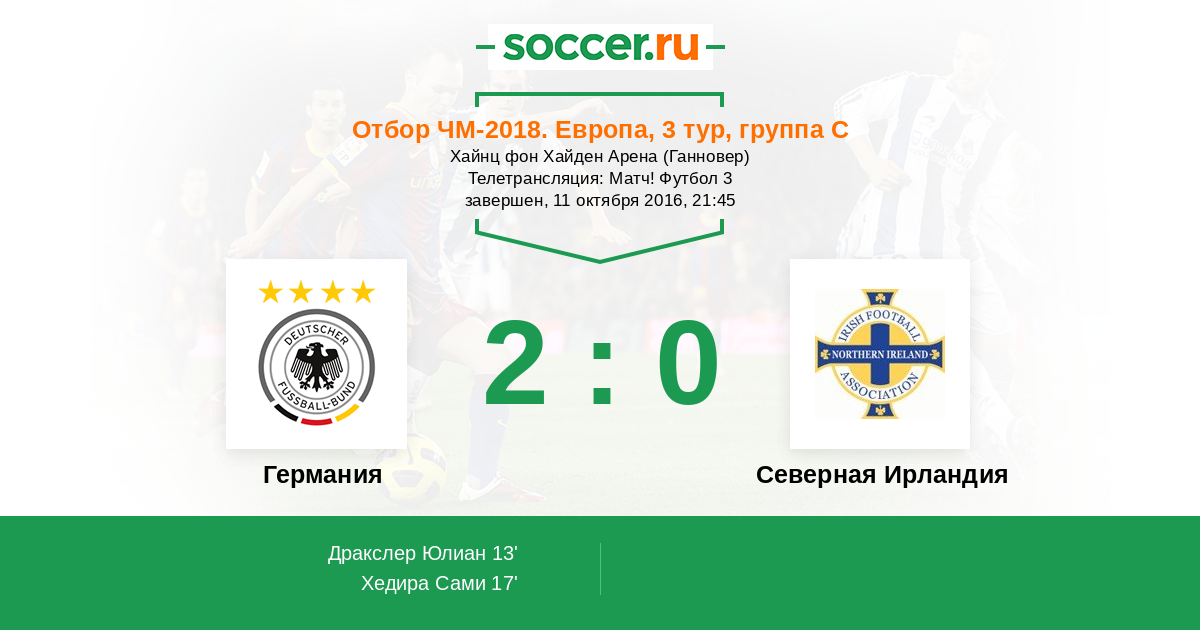 Здравствуйте, уважаемые любители спорта №1! Сегодня состоятся последние матчи 3-его тура квалификации среди европейских команд к Чемпионату Мира 2018, который пройдет в России. Совсем недавние участники ЕВРО 2016 во Франции сборные Германии и Северной Ирландии встретятся между собой в Ганновере на "Эйч-Ди-Ай-Арене". И немцы, и североирландцы пробились в "плэй-офф" на Чемпионате Европы, поэтому по праву являются фаворитами в группе "С" в борьбе за путевки на грядущее мировое первенство. Разумеется, что подопечные Йохима Лева в больше степени претендуют на первое место, которое позволяет гарантированно выйти напрямую. Наверняка, дружина Майкла О'Нила сегодня выставит крепкую оборону, которая попытается всячески противостоять действующим обладателями Кубка Мира. "Соккер.ру" будет наблюдать за главными событиями матча между сборными Германии и Северной Ирландии, текстовую онлайн-трансляцию которого для вас проведу я, Роман Земко. Стартовый свисток прозвучит в исполнении итальянского рефери Паоло Тальявенто в 21.45 по московскому времени. Не пропустите!