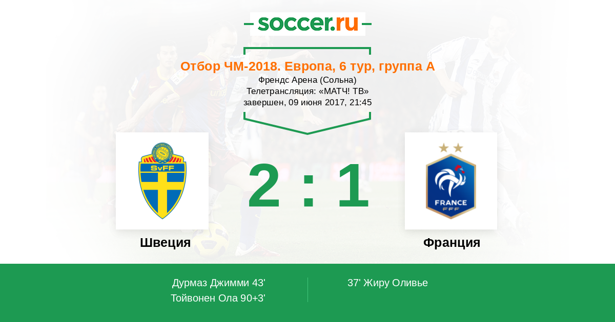 Подопечные Дидье Дешама последние минуты обосновались на чужой половине поля и пытались дожать соперника, однако ошибка Уго Льориса привела к неожиданному голу сборной Швеции, который принес "сине-желтым" победу над французами! Команда Янне Андерссона не выключалась из игры до последней минуты и сполна использовала предоставленный шанс! Сборная Швеции догоняет по набранным очкам сборную Франции, а это означает, что борьба за первое место в группе A продолжается! Предлагаем выбрать лучших игроков в составах команд, комментировал для вас Дмитрий Отмахов. До новых встреч на soccer.ru.