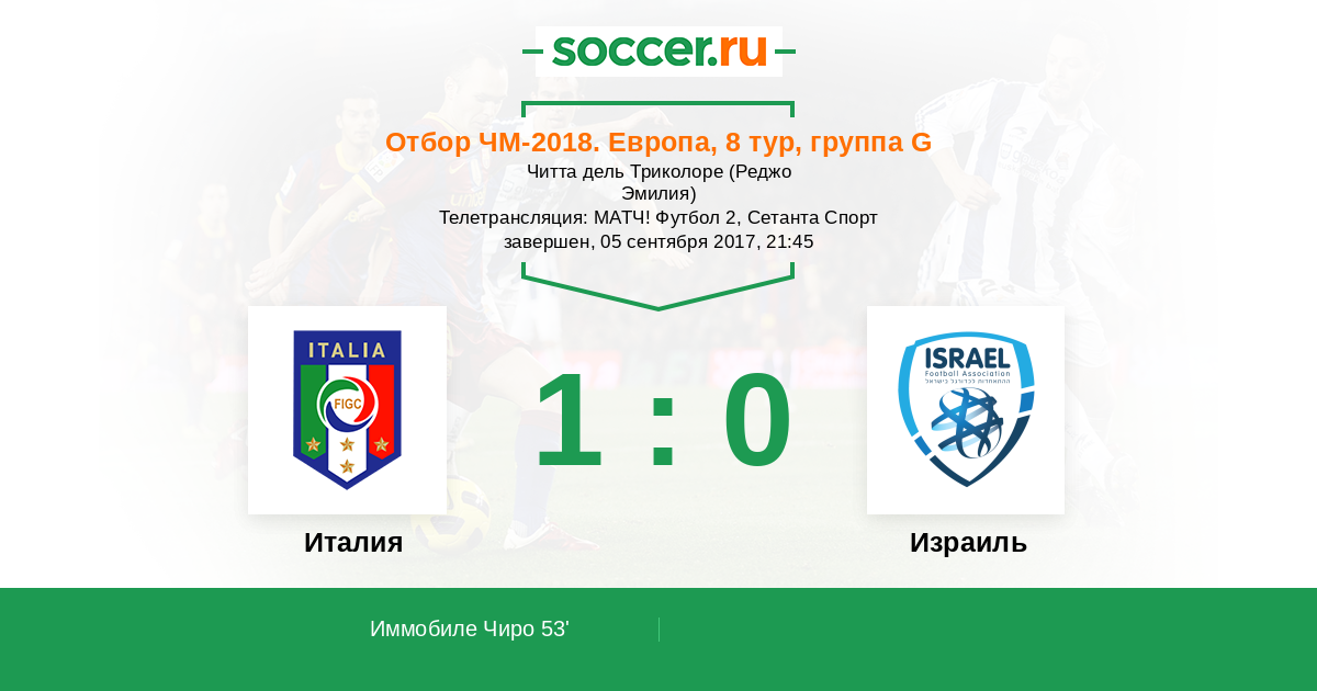Итальянцы активно провели вторую половину встречи и всё-таки одержали минимальную победу. Несмотря на довольно слабую игру "Скуадра Адзурра" добилась своего, заработав важные три очка. В параллельном поединке сборная Албании сыграла вничью с Македонией, а значит отрыв команды Джампьеро Вентуры увеличился до шести баллов. В следующем туре итальянцы будут принимать всё тех же македонцев, а команда Израиля отправится в Лихтенштейн. Текстовую онлайн-трансляцию провел Глеб Васильев. До новых встреч на "Соккер.Ру"!