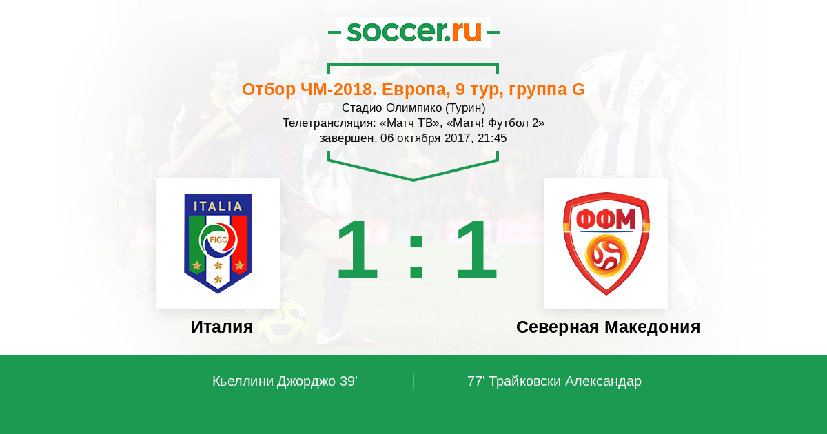 Очередной невзрачный матч под руководством Вентуры выдает сборная Италии, сыграв вничью со сборной Македонии. Во втором тайме подопечные Ангеловски не сдались, показали характер и абсолютно заслуженно увезли один балл из Турина. Ничья гарантирует итальянцам место в стыках, но если "Скуадра Адзурра" и там намерена показывать такой же футбол, то вполне возможно, что в Россию Буффон и компания может и не поехать. Уважаемые пользователи "Соккер.ру", Вы можете определить лучших игроков на Ваш взгляд. Текстовую онлайн-трансляцию вел Роман Земко. Всего доброго!