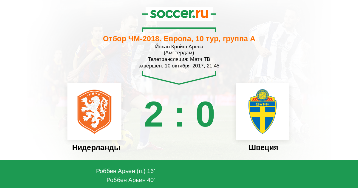 Голландцы одержали победу, но остались без чемпионата мира 2018 года. Сборная Швеции в данном поединке не ставила перед собой серьезных задач и ожидаемо добыла путевку в стыковые матчи. Стоит отметить перфоманс Арьена Роббена, который сегодня сделал всё возможное для многочисленных фанатов оранжевой команды. Не забудьте выбрать лучших игроков в составах обоих коллективов. Текстовую онлайн-трансляцию провёл Глеб Васильев. До новых встреч на Soccer.Ru!