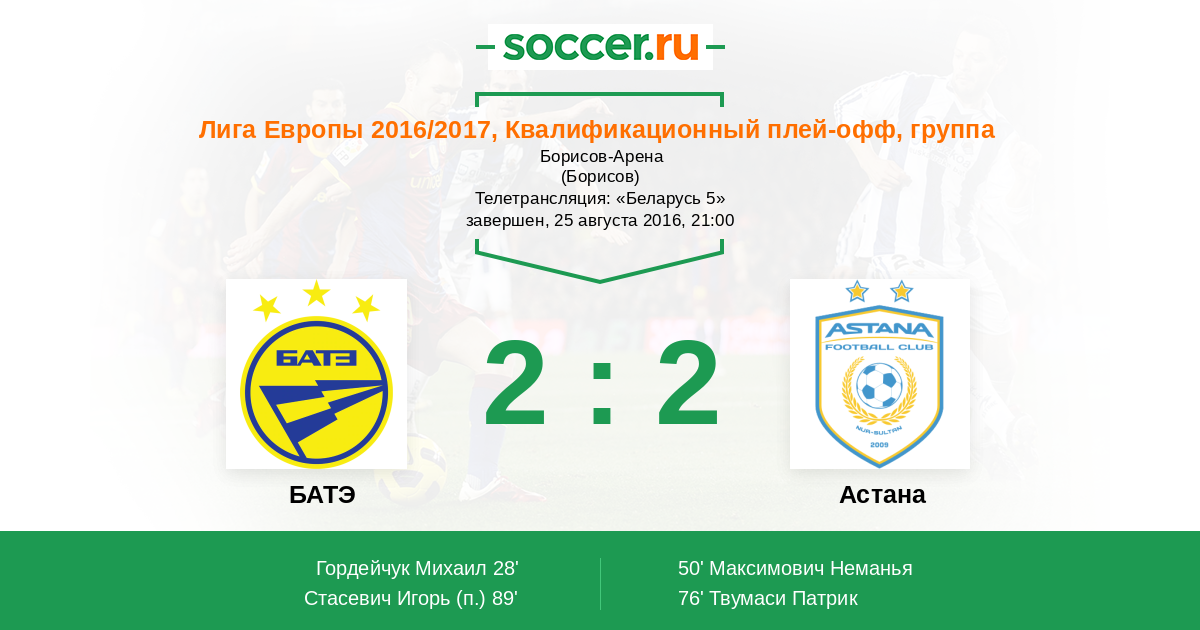 Приветствуем всех любителей футбола! Вслед за всеми участниками самого престижного турнира Старого Света сегодня определятся команды, которые будут держать свой путь на групповой стадии Лиги Европы. В одной из пар, где пока не совсем все ясно после первого матча в Казахстане, футбольный клуб "БАТЭ" на своем поле примет "Астану". Напомним, что встреча недельной давности закончилась победой подопечных болгарского специалиста Станимира Стойлова со счетом 2-0, и перед борисовчанами теперь стоит сложная задача по обеспечению для себя и своих болельщиков еврокубковой осени. http://www.soccer.ru/ будет следить за основными событиями матча, текстовую онлайн-трансляцию проведет для вас Роман Земко. Стартовый свисток прозвучит в 21.00 по московскому времени. Ждем интересного футбола!
