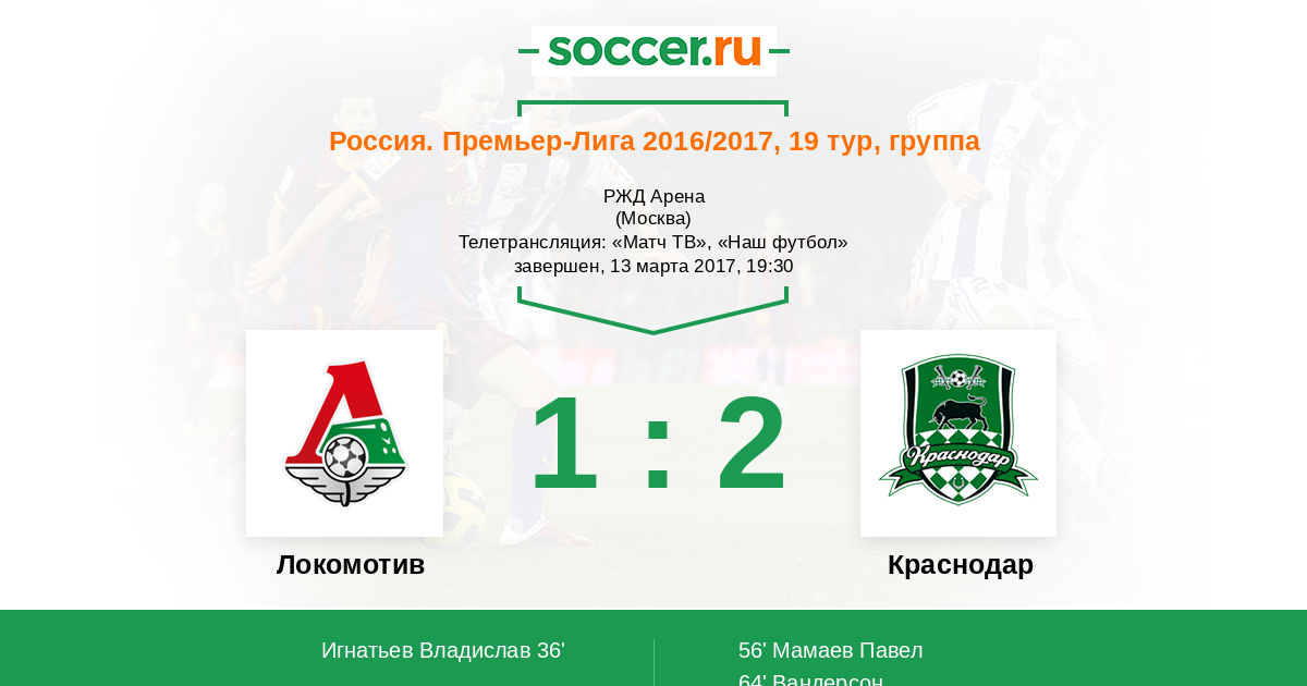 "Краснодар" одерживает волевую победу над "Локомотивом" и выход на 4-ую строчку в турнирной таблице! Между прочим, сегодняшняя виктория "быков" является первой гостевой в этом сезоне. Необходимо отметить тренерское чутье Игоря Шалимова, выпустившего Павла Мамаева, который оказался в нужное время и в нужном месте, сравняв счет. "Локомотив" остается на 10-ом месте в таблице, и еще дальше отдаляется от еврокубковой зоны. Вы можете определить лучших игроков на Ваш взгляд. Комментировал для Вас Роман Земко. Оставайтесь на "Соккер.ру"!