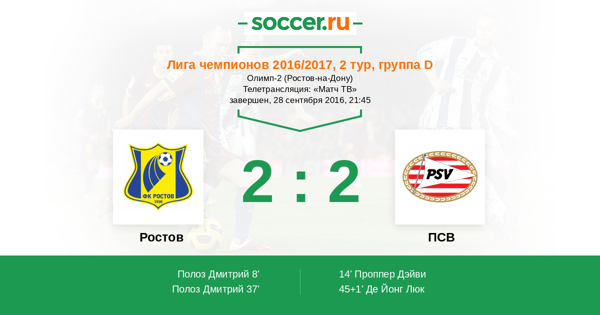 Смешанные чувства после финального свистка, надо признать. С одной стороны, "Ростову" не повезло, особенно в первом тайме: Полоз забил два отличных, породистых гола, а в ворота Джанаева залетело что-то совсем не понятное, и оба раза рикошеты были не на стороне хозяев поля. С другой стороны, возможно фарт пришел во второй половине, когда у "ПСВ" было 2-3 стопроцентных момента, но и пенальти вратарь "дончан" отразил, и после удара Проппера в перекладину мяч отскочил прямо в руки Сослану. Это футбол, дамы и господа, он бывает не предсказуем! Мы предлагаем вам определить лучших игроков матча. Текстовую онлайн-трансляцию для вас вел Роман Земко. До новых встреч на "Соккер.ру"!