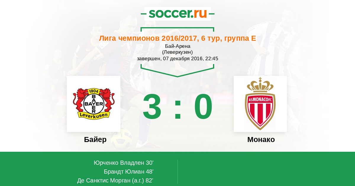 На мажорной ноте заканчивают групповой этап Лиги Чемпионов подопечные Роджера Шмидта! Догнать "монегасков" в таблице все равно не удалось, но зато "аспириновые" порадовали своих болельщиков отличной игрой и красивыми голами. Теперь "Байеру" и "Монако" остается ждать жеребьевки, на которой команды узнают своих соперников в плэй-офф. Вы можете определить лучших игроков матча на Ваш взгляд. Текстовую онлайн-трансляцию вел Роман Земко. Следите за футболом на "Соккер.ру"!