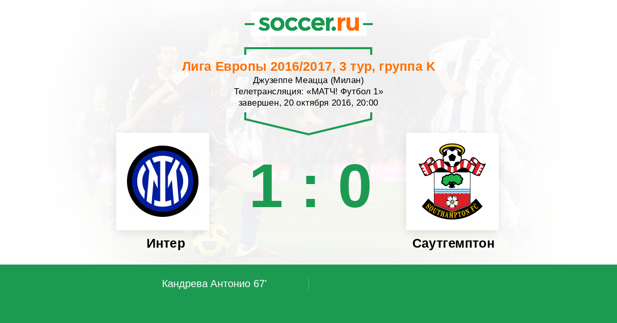 Подопечные Франка де Бура благодаря голу Антонио Кандревы набирают первые очки в Лиги Европы! Изменил ход игры забитый мяч, так как до этого момента ближе к победе были футболисты "Саутгемптона", которые за матч создали немало голевых моментов. Даже удаление в составе "Интера" не помогло "святым" спасти игру! Предлагаем выбрать лучших игроков в составах команд, комментировал для вас Дмитрий Отмахов. До новых встреч на soccer.ru.