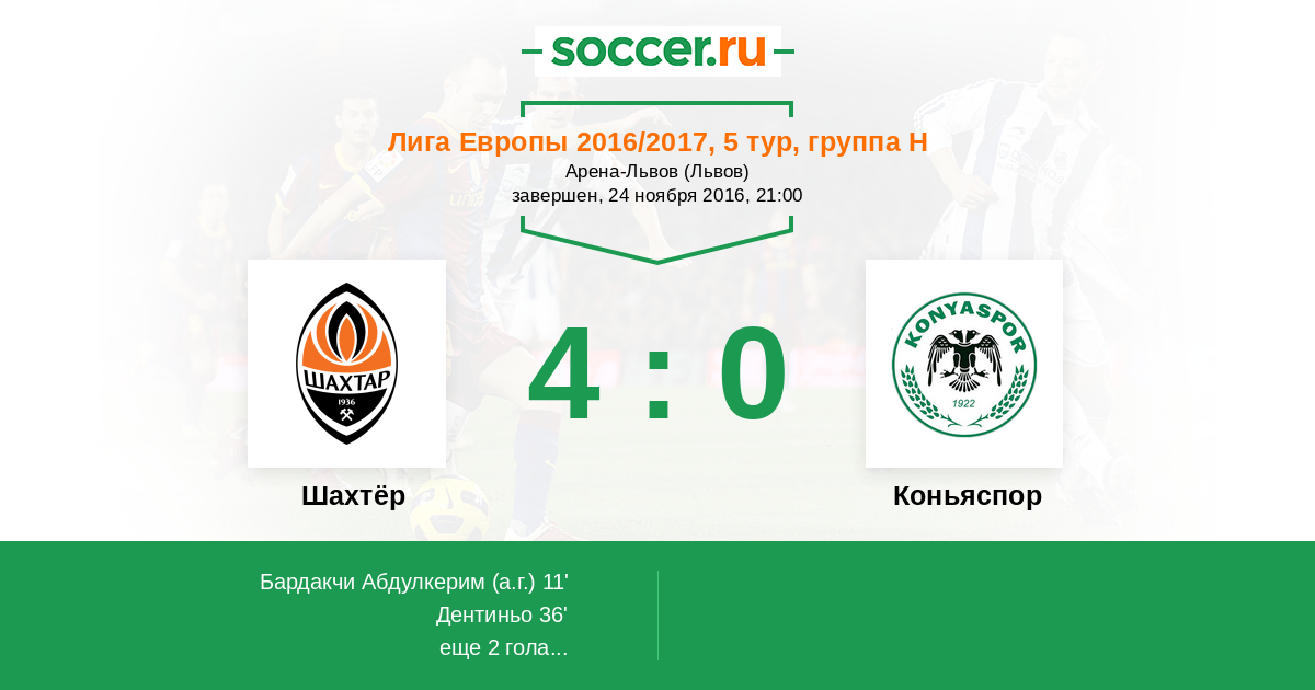Все! Матч завершен! Донецкий "Шахтер" подтверждает свое реноме главного фаворита не только группы, но и всего турнира, одержав пятую подряд победу в рамках группового этапа Лиги Европы. "Горняки" спокойно переиграли "Коньяспор" со счетом 4:0 благодаря автоголу Бардакчи и голам Дентиньо, Эдуардо и Бернарда. Предлагаем Вам выбрать лучших игроков этого матча в составах обеих команд. Для Вас онлайн-трансляцию поединка провел Андрей Бабенчук. Оставайтесь на http://www.soccer.ru/ !