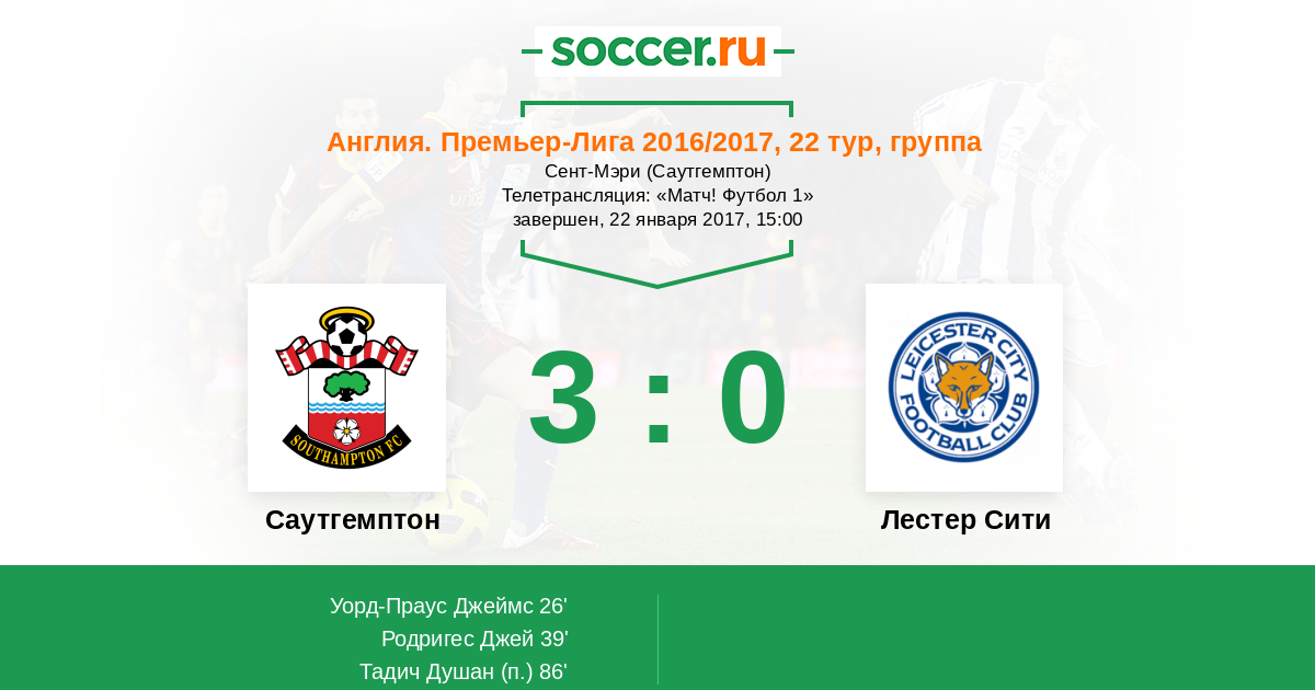 Все! Матч завершен! "Саутгемптон" уверенно разгромил действующих чемпионов Англии со счетом 3:0 благодаря голам Джеймса Уорда-Прауса, Джея Родригеса и Душана Тадича. Предлагаем Вам выбрать лучших игроков этого матча в составах обеих команд. Для Вас прямую онлайн-трансляцию этого матча провел Андрей Бабенчук. До новых встреч на http://www.soccer.ru/ !