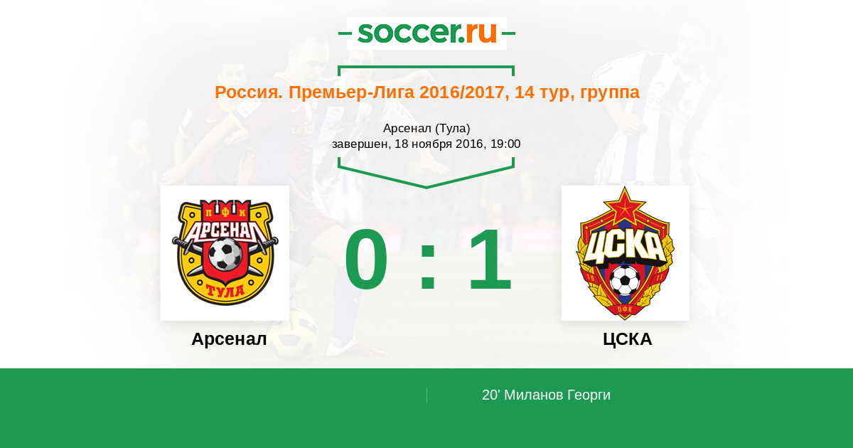 Здравствуйте, уважаемые любители футбола! Пауза на матчи национальных сборных завершилась, а следовательно возобновляется и всеми любимая РФПЛ! Сегодня в Туле в рамках 14 - го тура на стадионе "Арсенал" одноимённый футбольный клуб примет действующего чемпиона страны - ЦСКА. Московским "армейцам" необходимо выправлять своё положение в таблице: до занимающего вторую лигочемпионскую позицию "Зенита" шесть очков, а до ненавистного "Спартака" целых девять! Однако и "канониры" также нуждаются в очках ничуть не меньше, а может даже и больше соперника. Туляки всего лишь на один балл опережают замыкающие таблицу "Крылья". Это и неудивительно - единственная победа красно - жёлтых в чемпионате датирована ещё вторым туром, то есть началом августа! В общем, нас ожидает интересный поединок. Текстовую онлайн - трансляцию этой встречи на http://www.soccer.ru для вас проведёт Олег Олезов.