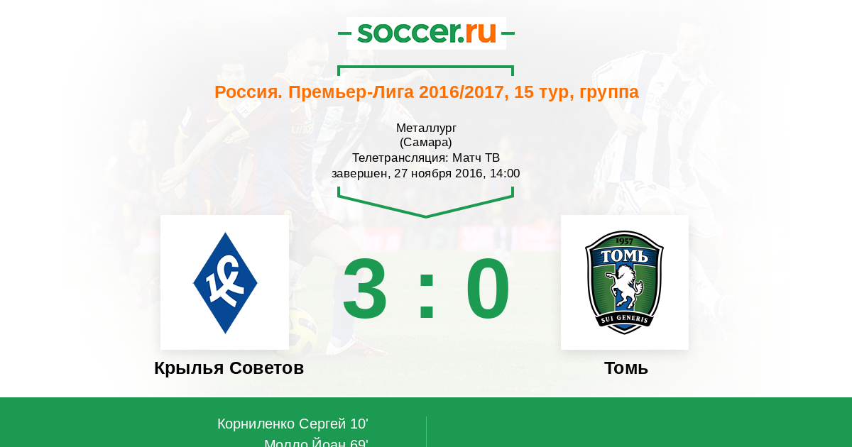 Добрый день, уважаемые любители российского футбола! Пятнадцатый тур чемпионата России продолжается, сегодня в 14:00 по московскому времени состоится битва двух команд из нижней части таблицы. «Крылья Советов» и «Томь» сыграют на самарском стадионе «Металлург» и будут бороться за важные для себя три очка. Сегодняшний матч будет обслуживать бригада арбитров во главе с Сергеем Карасёвым – рефери из Москвы. «Соккер.Ру» проведёт текстовую онлайн-трансляцию встречи, главные события которой будет освещать Глеб Васильев.