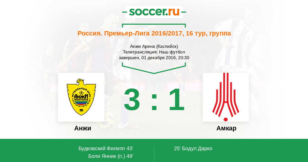 Добрый вечер, уважаемые любители футбола! Сегодняшний игровой день в российской Премьер-Лиге завершится противостоянием махачкалинского «Анжи» и пермского «Амкара». Матч пройдёт на стадионе «Анжи-Арена» и начнётся в 20:30 по московскому времени. В последних очных встречах команд сильнее оказывались «красно-чёрные», может быть, именно сегодня эта серия прервётся, и преимущество будет на стороне хозяев? Присоединяйтесь к «Соккер.Ру» и следите текстовой онлайн-трансляцией данного поединка, главные события которого будет освещать Глеб Васильев.