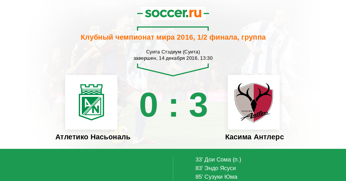 Атлетико Насьональ - Касима Антлерс: обзор матча 14 декабря 2016