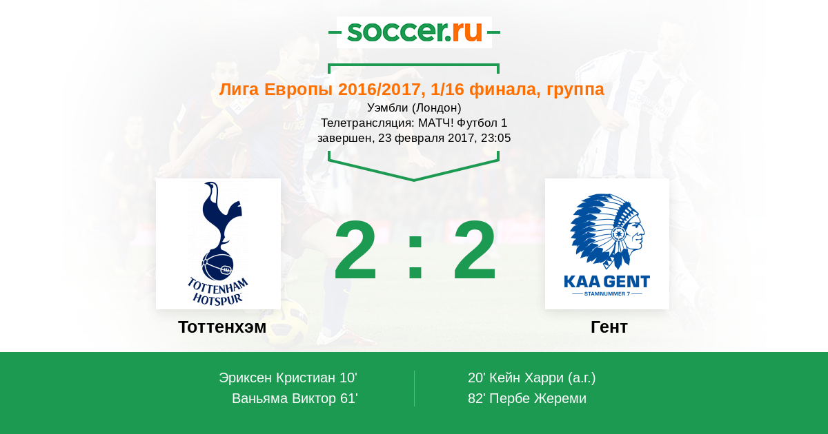 Приветствуем всех любителей европейского футбола! Сегодня определятся все участники 1/8 финала Лиги Европы. Мы отправляемся в Лондон, где на стадионе «Уэмбли» состоится ответный поединок местного «Тоттенхэма» и бельгийского «Гента». «Соккер.Ру» проведёт текстовую онлайн-трансляцию данной встречи, главные события которой будет освещать Глеб Васильев. Начинаем в 23:05!