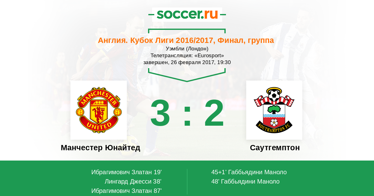 ВСЁ! Выигрывает "Манчестер Юнайтед" трофей Кубка английской Лиги! Вырвали манкунианцы победу в ожесточённой битве со "святыми"! В дебюте второго тайма Маноло Габбьядини сравнял счёт, оформив дубль, но всё-таки стать главным героем встречи ему было не суждено. На 87-й минуте Златан Ибрагимович вонзил мяч в сетку, забив мяч, ставший победным! Вполне заслуженно, что именно Ибра стал лучшим игроком матча. Пришлось изрядно попотеть "красным дьяволам", но победителей ведь не судят! С победой МЮ и его болельщиков! "Саутгемптон" можно только поблагодарить - команда Клода Пюэля до последних секунд имела шансы на конечный успех! На этом всё. С вами был Олег Олезов. Вы можете выбрать лучших игроков матча. Спасибо за внимание и до новых встреч на http://www.soccer.ru