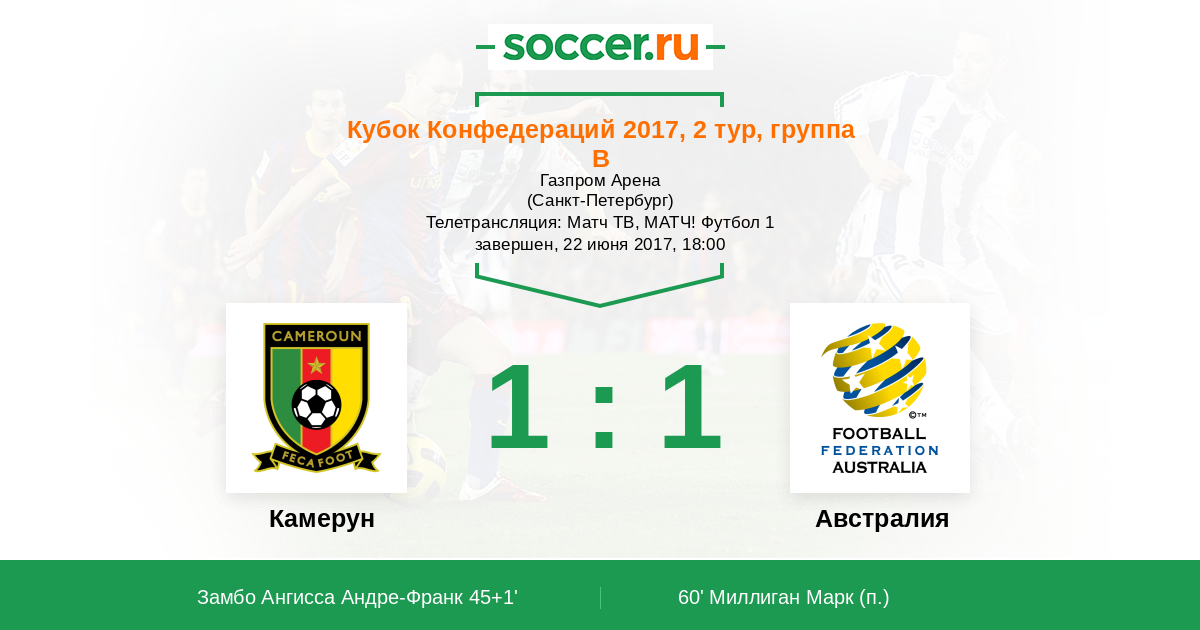 Приветствуем всех любителей футбола на «Соккер.Ру»! Кубок Конфедераций в самом разгаре, настало время второго тура в группе «B». Первым матчем сегодняшнего игрового дня станет противостояние сборных Камеруна и Австралии. Данную встречу можно назвать битвой андердогов турнира, каждому из которых сегодня нужна победа для включения в борьбу за потенциальный выход в плей-офф. Вполне вероятен и ничейный результат, который, скорее всего, поставит крест на перспективах обеих команд, ведь в третьем туре их ждут матчи с нынешними лидерами квартета в лице национальных коллективов Германии и Чили. Текстовую онлайн-трансляцию проведёт Глеб Васильев. Начинаем в 18:00!