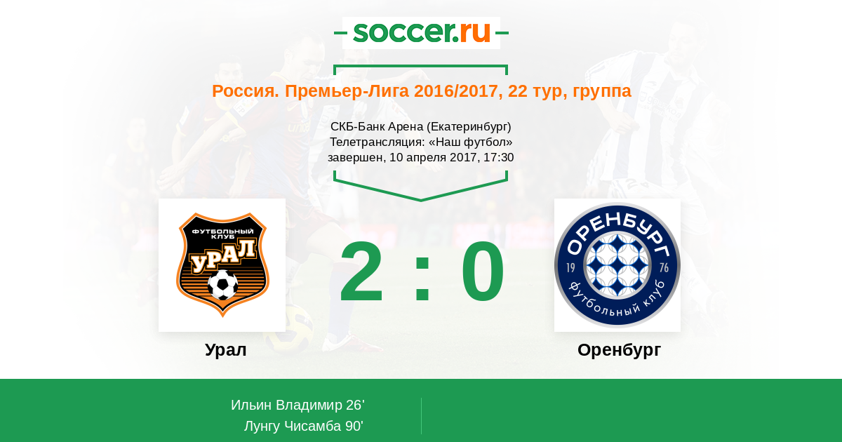 "Урал" одерживает победу со счетом 2-0 над "Оренбургом", обгоняет в таблице "Анжи" и вырывается на 11-ую строчку, в то время как сегодняшние гости так и остались в зоне прямого вылета. Не заслуживали поражения подопечные Роберта Евдокимова, которые во втором тайме имели множество отличных моментов, чтобы и сравнять цифры на табло, и даже выйти вперед (чего только стоят два промаха в пустые ворота Дмитрия Ефремова), но в итоге получили еще и контратаку под занавес основного времени, позволив "шмелям" отличиться второй раз. Вы можете определить лучших игроков на Ваш взгляд. Комментировал для Вас Роман Земко. До новых встреч на "Соккер.ру"!
