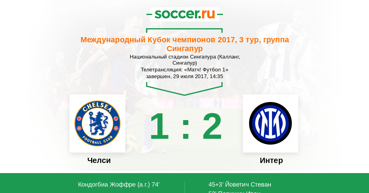Все! Матч завершен! Миланский "Интер" одержал очередную победу на Международном Кубке чемпионов! На этот раз "черно-синие" обыграли действующих чемпионов Англии - лондонский "Челси" со счетом 2:1. Голами в составе команды Спаллетти отметились Йоветич и Перишич, также гол в свои ворота забил Жоффри Кондогбиа. Предлагаем Вам выбрать лучших игроков этого матча в составах обеих команд. Для Вас прямую онлайн-трансляцию этого поединка провел Андрей Бабенчук. Оставайтесь на http://www.soccer.ru/