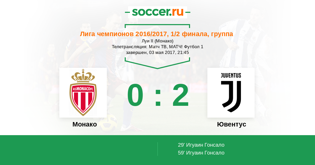 "Ювентус" продемонстрировал футбол высокого класса и теперь возвращается в Турин с комфортным преимуществом. Во второй половине встречи "Монако" упорно сопротивлялся, но свои моменты реализовать не смог. "Бьянконери" же сильно не рисковали, на 59 минуте связка Дибала - Алвес - Игуаин оформила второй гол в ворота соперника, установив итоговый счёт - 2:0. Массимилиано Аллегри выиграл дуэль у Леонарду Жардима, а появление Дани Алвеса в стартовом составе оказалось правильным на 100%. На счету бразильца две голевые передачи и отличная игра на протяжении всего матча. Не будем досрочно отправлять "Ювентус" в финал, но шансы "красно-белых" на спасение небольшие. Ответный поединок состоится 9 мая на "Ювентус Стэдиум". Текстовую онлайн-трансляцию провёл Глеб Васильев. Продолжайте следить за европейским футболом на Soccer.Ru!