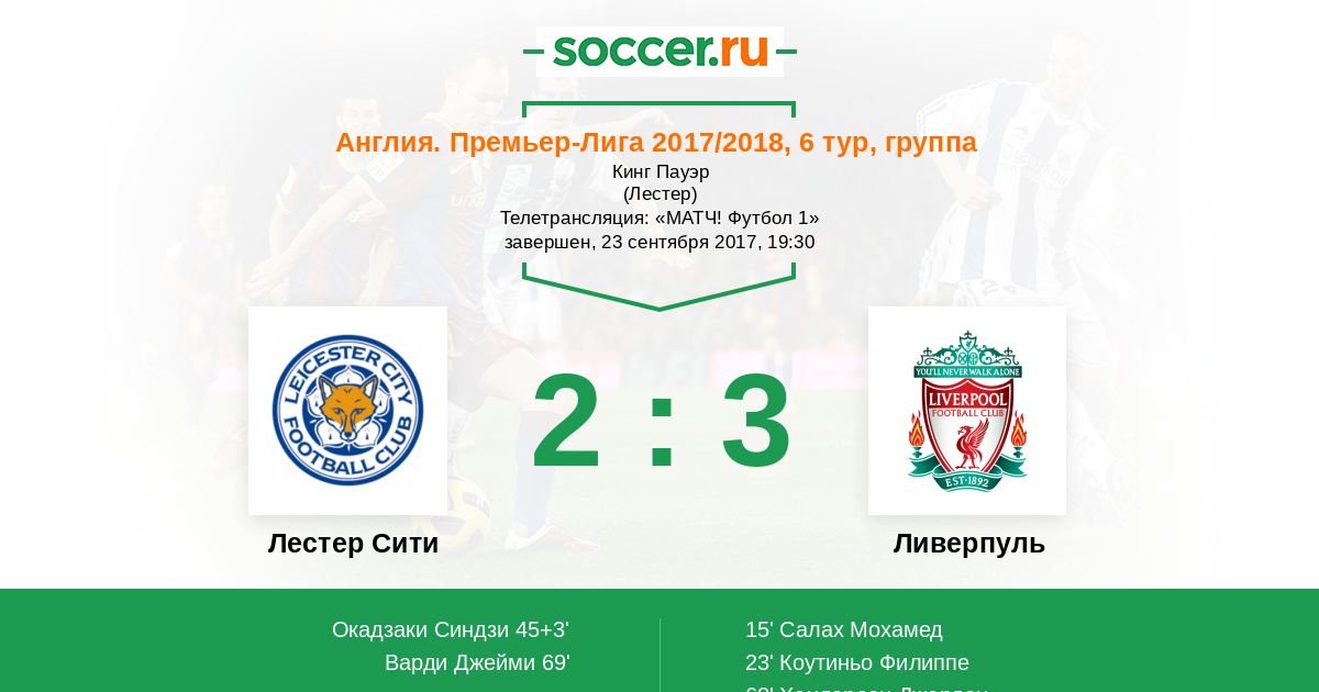 Добрый вечер, уважаемые любители футбола! Сегодня в рамках шестого тура Английской Премьер-Лиги в гости к "Лестеру" пожалует "Ливерпуль". Стоит отметить, что четыре дня назад команды играли между собой в рамках третьего раунда Кубка Английской Лиги, победу в этом матче со счетом 2:0 одержали "лисы". "Ливерпуль" играл в матче Кубка Лиги полурезервным составом, так что сегодня стоит ожидать совершенно другой игры. На данный момент подопечные Юргена Клоппа, имея в активе восемь очков, располагаются на восьмом месте в турнирной таблице, а "Лестер", имея отставания от "мерсисайдцев" в четыре очка находится на пятнадцатой строчке. Букмекеры отдают предпочтения в сегодняшнем матче "красным", но навряд ли "лисы" собираются дарить сопернику три очка, так что нас ждет интереснейшая и непредсказуемая игра. Вместе с Вами следить за событиями этого увлекательного матча на soccer.ru будет Дмитрий Отмахов.