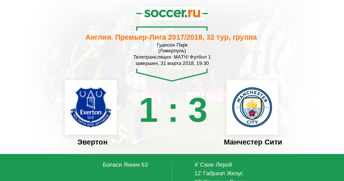 Добрый день, уважаемые пользователи Soccer.Ru! Заключительным матчем сегодняшнего игрового дня в Премьер-Лиге станет противостояние «Эвертона» и «Манчестер Сити». Обслуживать данную игру будет бригада арбитров во главе с Полом Тирни. Встречаемся на «Гудисон Парк» в 19:30 – не пропустите!