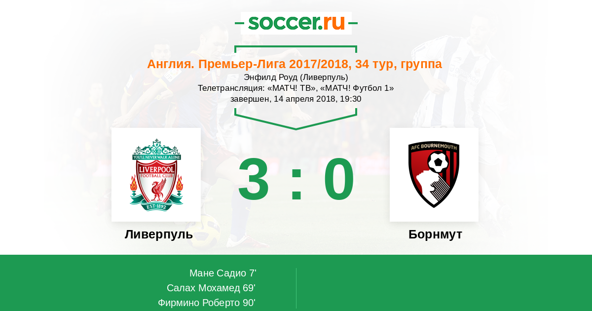 Доброго времени суток, уважаемые любители футбола! Сегодня в рамках тридцать четвертого тура Английской Премьер-Лиги в гости к "Ливерпулю" пожалует "Борнмут". Подопечные Юргена Клоппа уже практически гарантировали себе место в ТОП-4, на данный момент отрыв "мерсисайдцев" от идущего на пятом месте "Челси" составляет десять очков. "Борнмут" располагается в середине турнирной таблице, команда Эдди Хоу практически обезопасила себя от вылета в чемпионшип, для достижения этой цели "вишням" остается набрать два балла. В матче первого круга "Ливерпуль" разгромил "Борнмут" со счетом 4:0, голами в составе "красных" отметились Филиппе Коутиньо, Деян Ловрен, Мохамед Салах и Роберто Фирмино. Посмотрим, удастся ли сегодня команде Эдди Хоу сдержать атаку "Ливерпуля"?! Вместе с Вами следить за событиями этого матча на soccer.ru будет Дмитрий Отмахов.