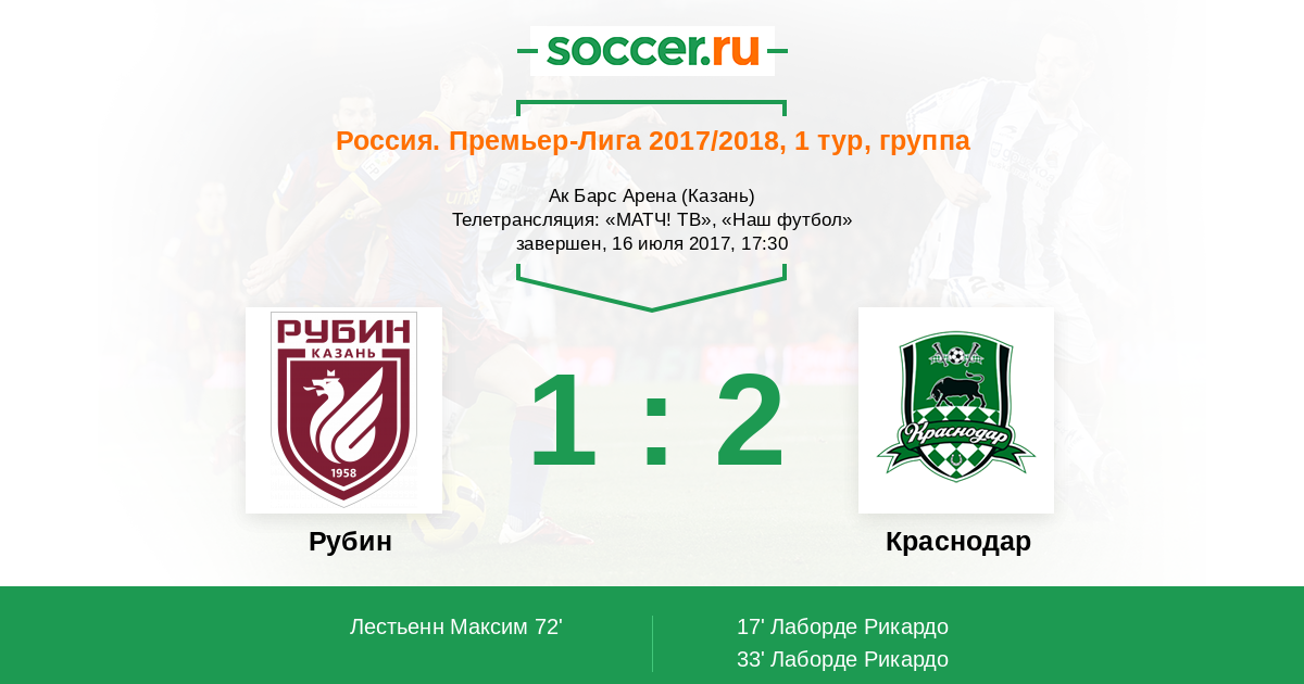 Подопечные Игоря Шалимова увозят из Казани три очка, дубль Рикардо Лаборде приносит важную победу "Краснодару"! "Рубин" во втором тайме заиграл поактивнее, однако уйти от поражения казанцы так и не смогли! Предлагаем выбрать лучших игроков в составах команд, комментировал для вас Дмитрий Отмахов. До новых встреч на soccer.ru.