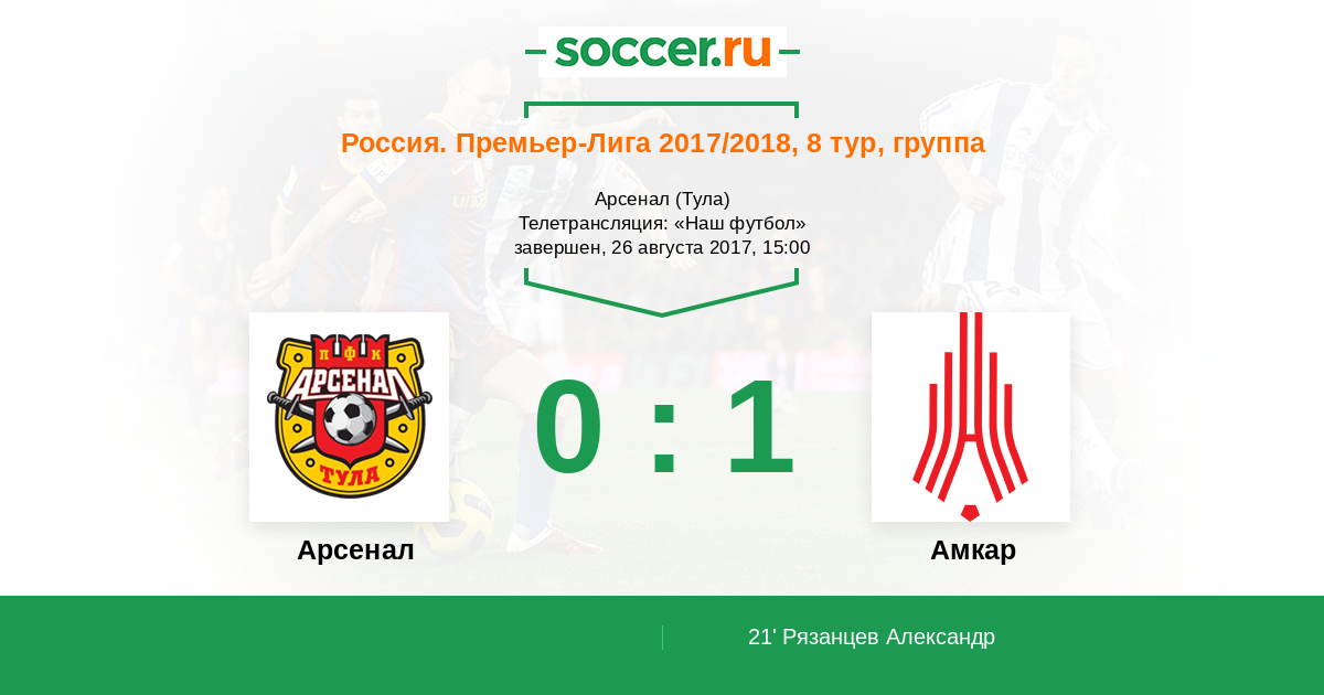 Так и не смогли подопечные Миодрага Божовича сравнять счет, "Амкар" увозит из Тулы очень важные три очка! "Арсенал" во втором тайме больше атаковал, но "оружейникам" не хватило немного удачи! Предлагаем выбрать лучших игроков в составах команд, комментировал для вас Дмитрий Отмахов. До новых встреч на soccer.ru.