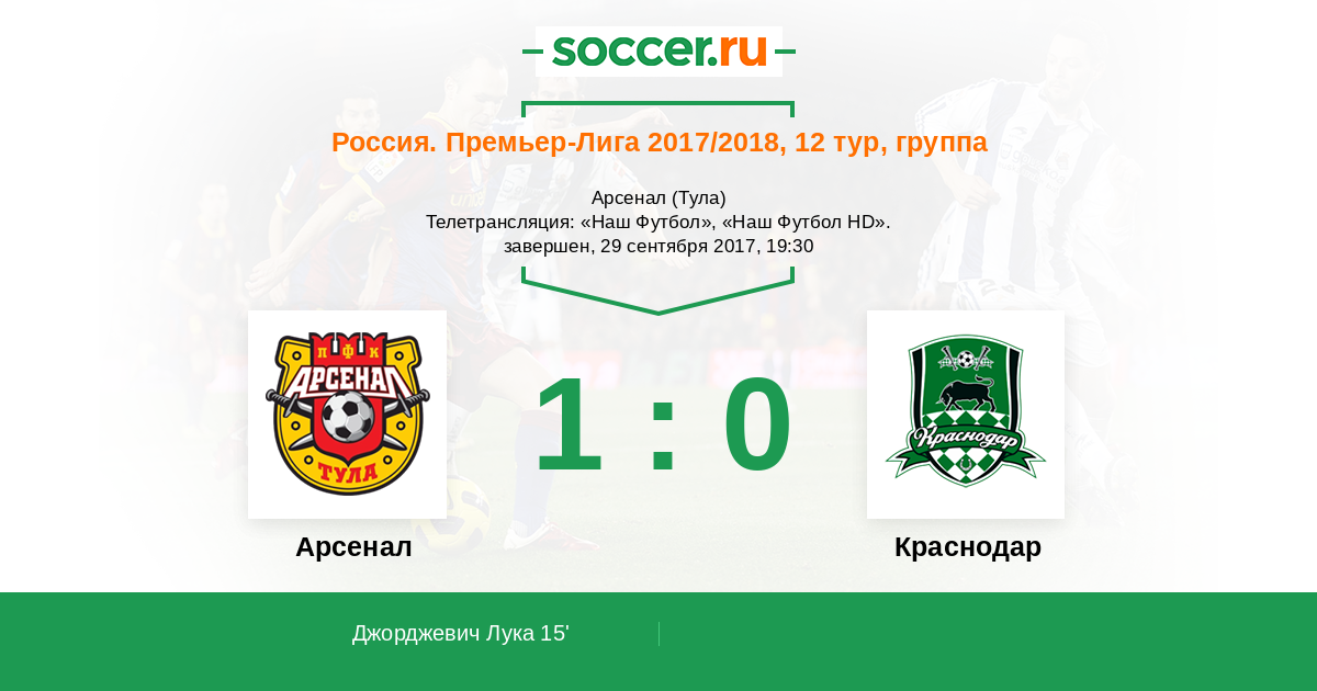 Добрый вечер, уважаемые любители российского футбола! Сегодня, матчем между "Арсеналом" и "Краснодаром" откроется 12-й тур РФПЛ. В таблице между соперниками уже образовалось довольно внушительное расстояние. Команды, решающие в нынешнем сезоне разные задачи, подходят к очному противостоянию не в лучшем расположении духа. В предстоящей встрече они постараются улучшить себе настроение. сможет ли тульский "Арсенал" что-то противопоставить команде Игоря Шалимова? Сайт http://www.soccer.ru проведёт прямую текстовую онлайн трансляцию матча, следить за событиями на поле и комментировать игру для вас будет Старчеус Сергей.