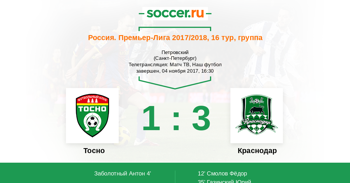 Приветствуем всех любителей футбола на «Соккер.Ру»! На связи стадион «Петровский», где сегодня в рамках 16-го тура РФПЛ лицом к лицу сойдутся «Тосно» и «Краснодар». Обслуживать данную встречу будет бригада арбитров во главе с Виталием Мешковым – рефери из Дмитрова. Текстовую онлайн-трансляцию проведёт Глеб Васильев. Начинаем в 16:30!